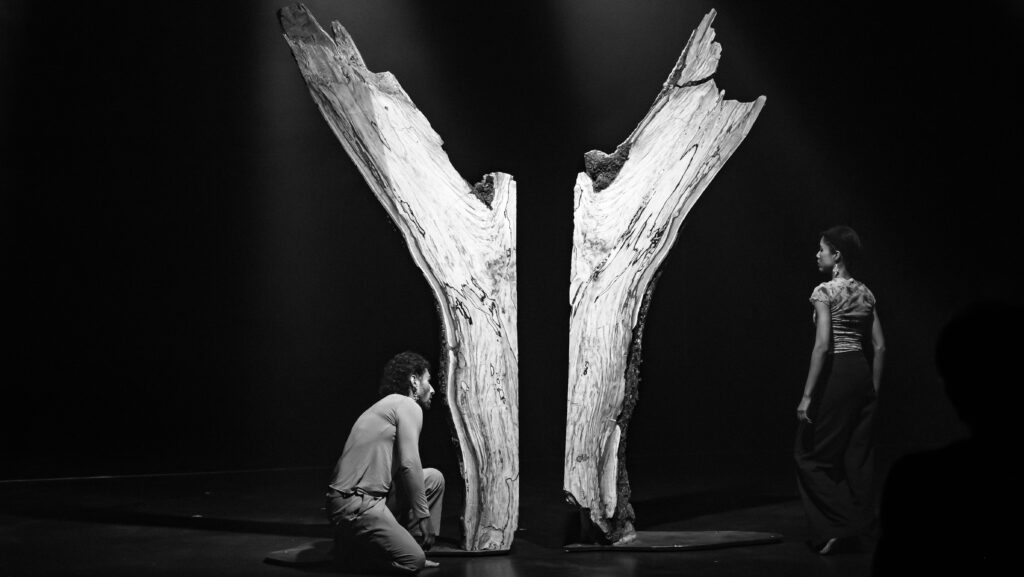 [H]être invite à la fois à une contemplation spatiale silencieuse et olfactive, à une installation conceptuelle sonore avec la projection sur grand écran de la captation de la performance chorégraphique ou en live avec ses six danseurs… Une expérience sensible : celle d’un arbre devenu mémoire, d’une matière devenue esprit.
